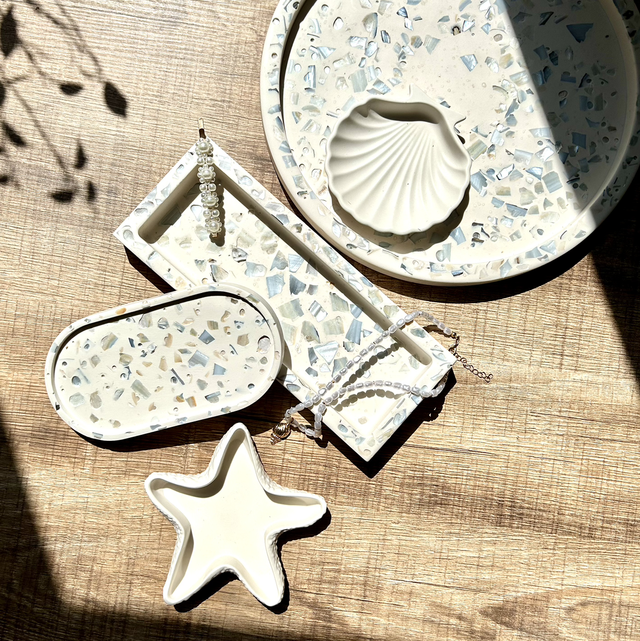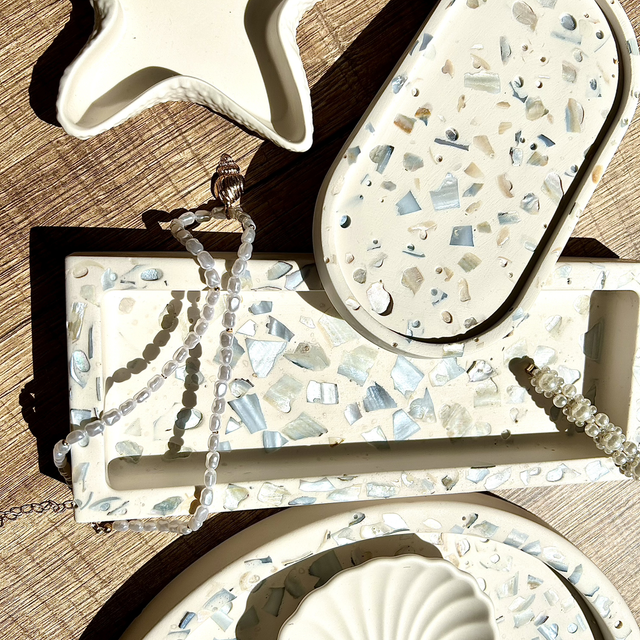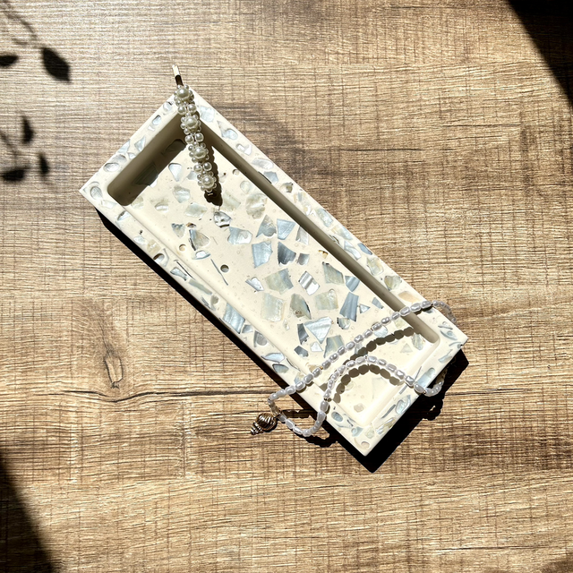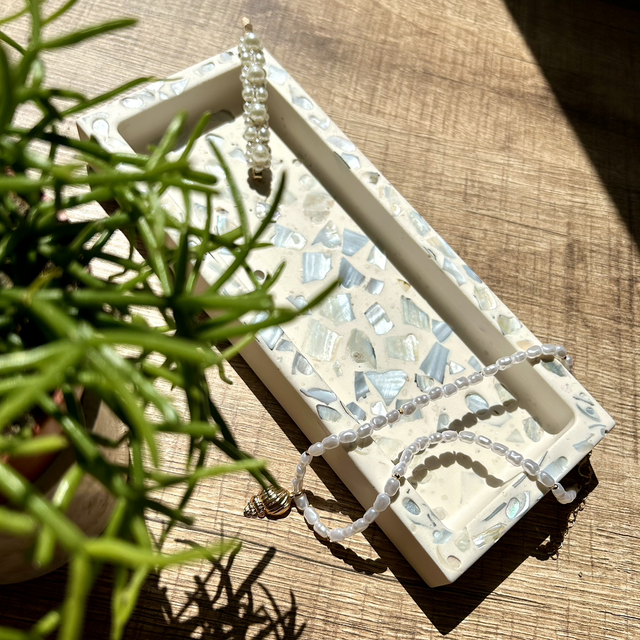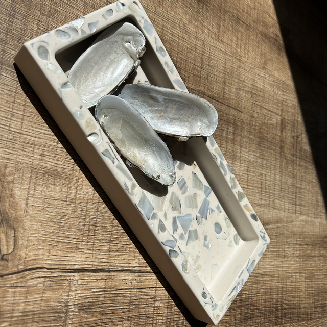 Grand plateau rectangulaire nacré, qui est une création spéciale fabriquée à partir de moules récoltées au bord du lac du Val Joly, un lac situé dans l'Avesnois. ⛵️