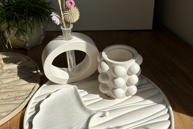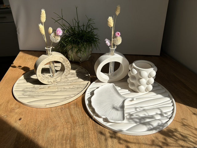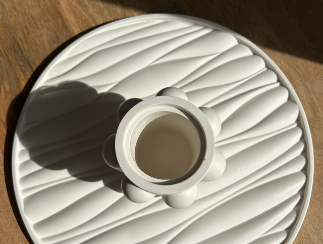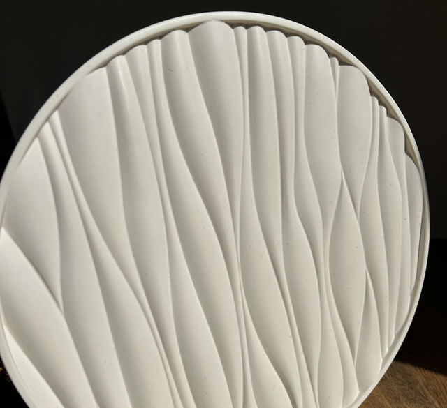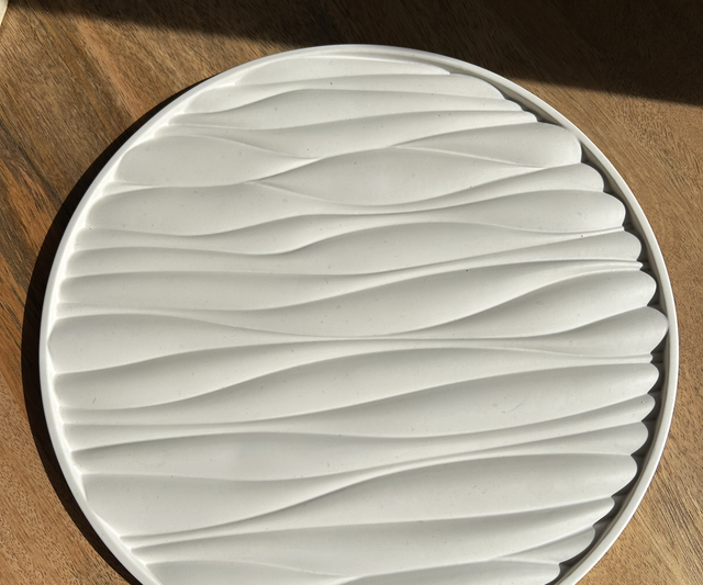 Grand plateau avec des formes ressemblantes à des vagues. Couleur blanc cassé.