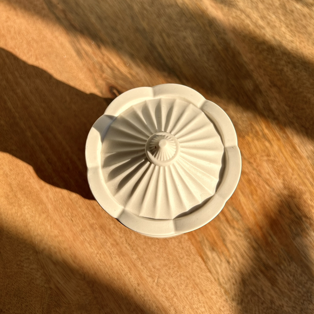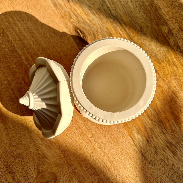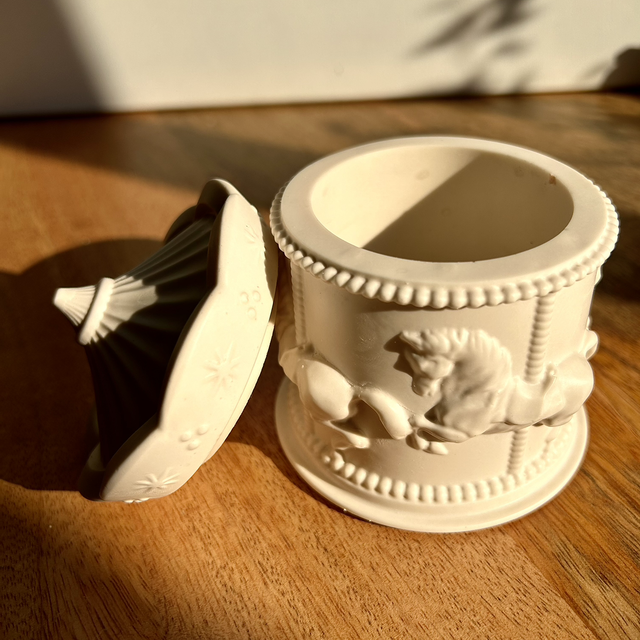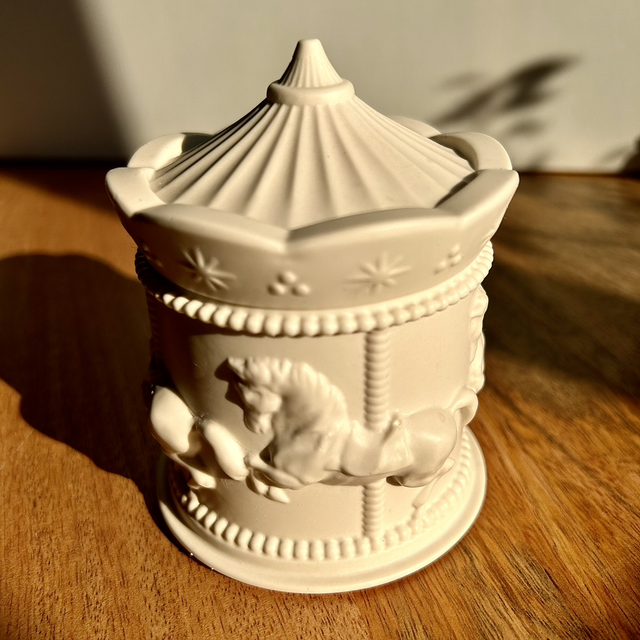 Voici une superbe boîte avec un effet carrousel de couleur blanche. Hauteur 11 cm avec la pointe. Diamètre 7,6cm.