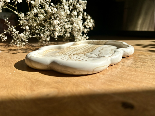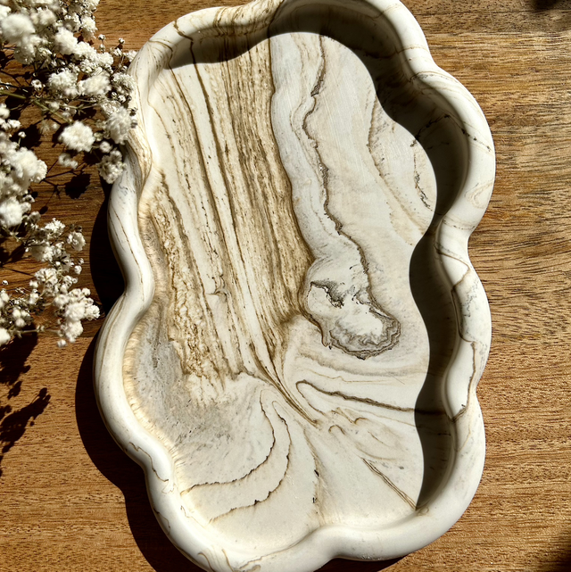 Plateau nuage effet marbre beige, taille 22 cm de longueur et 15 cm de largeur. Superbe pour mettre des bougies, des éléments de déco, dessus ou l’utiliser comme un vide poche.