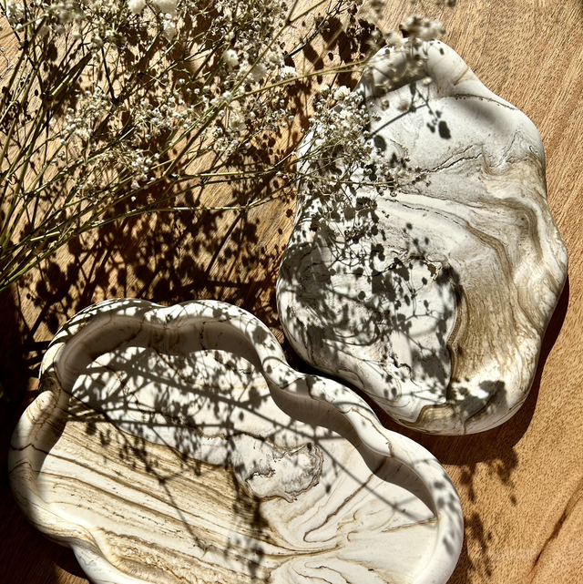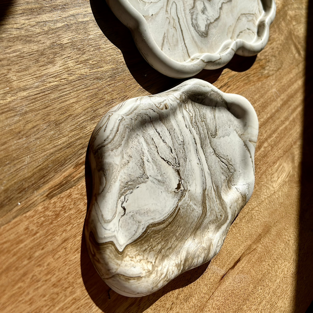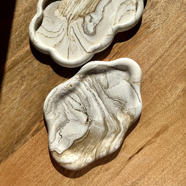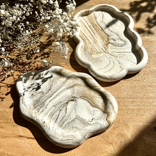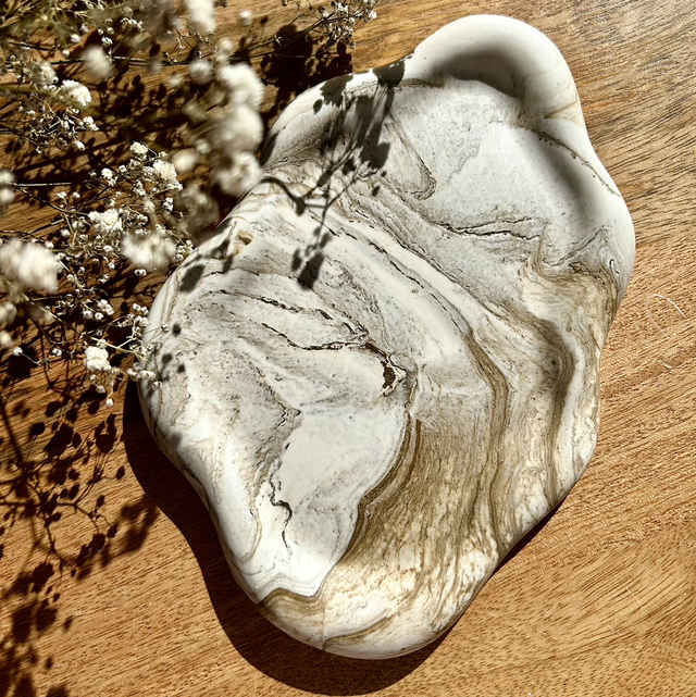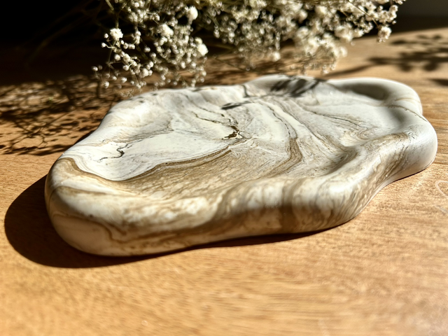 Voici un plateau ondulé avec un effet marbre beige. Taille longueur 19,4 cm, largeur 13 cm.