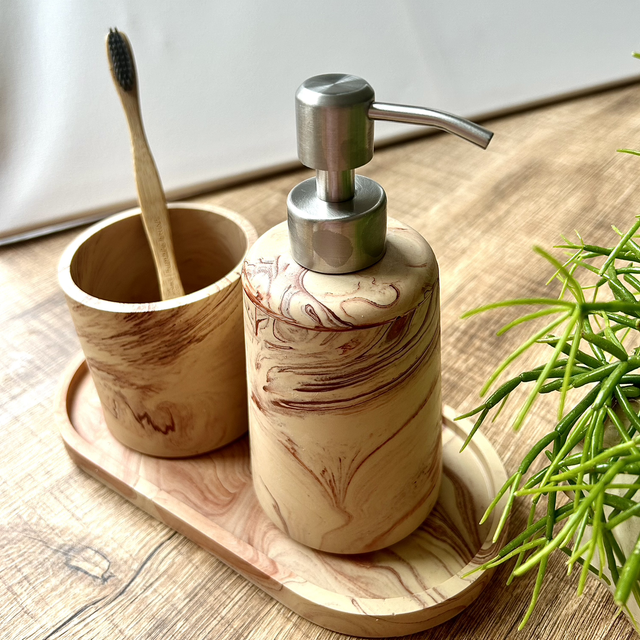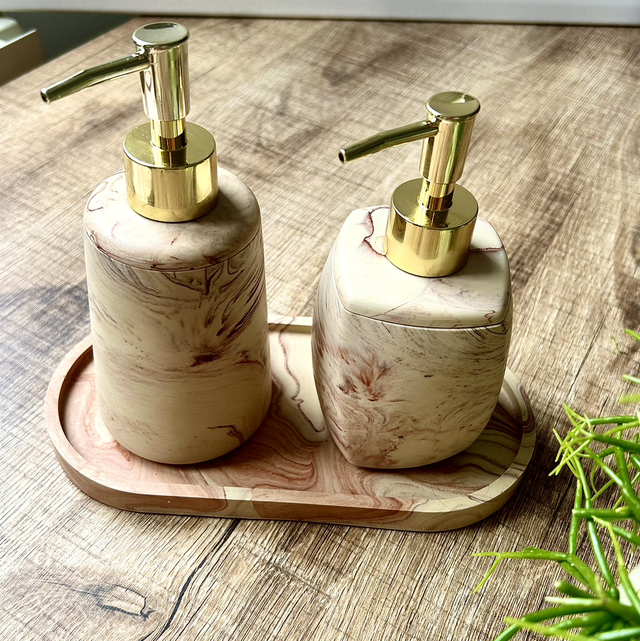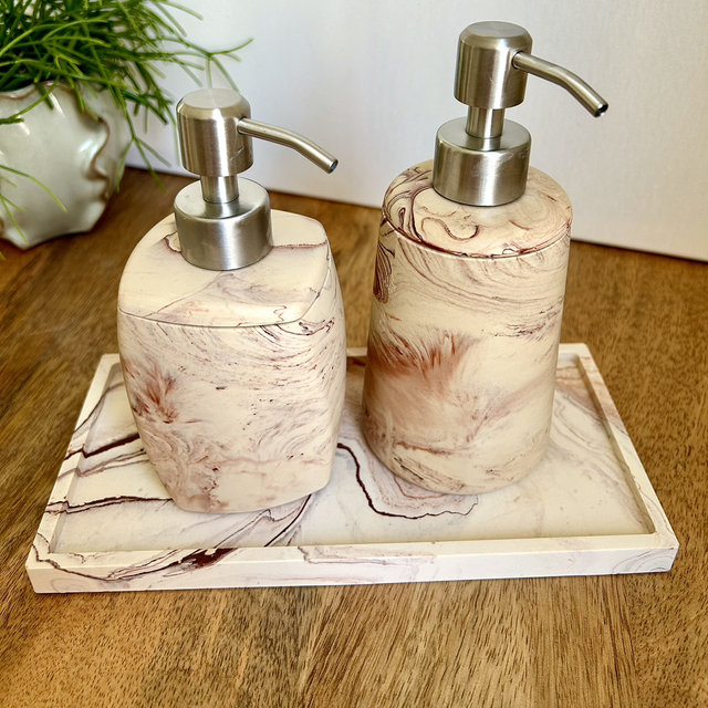 Pompe à savon beige avec effet marbre couleur Terracotta.