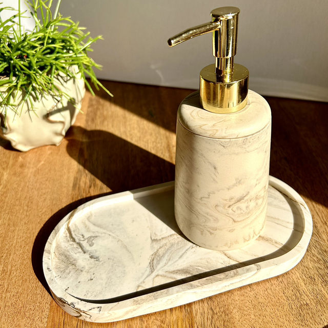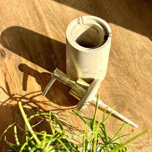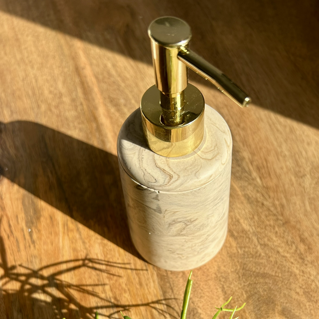 Grande pompe à savon effet marbre beige. Hauteur dans la pompe 11,8cm