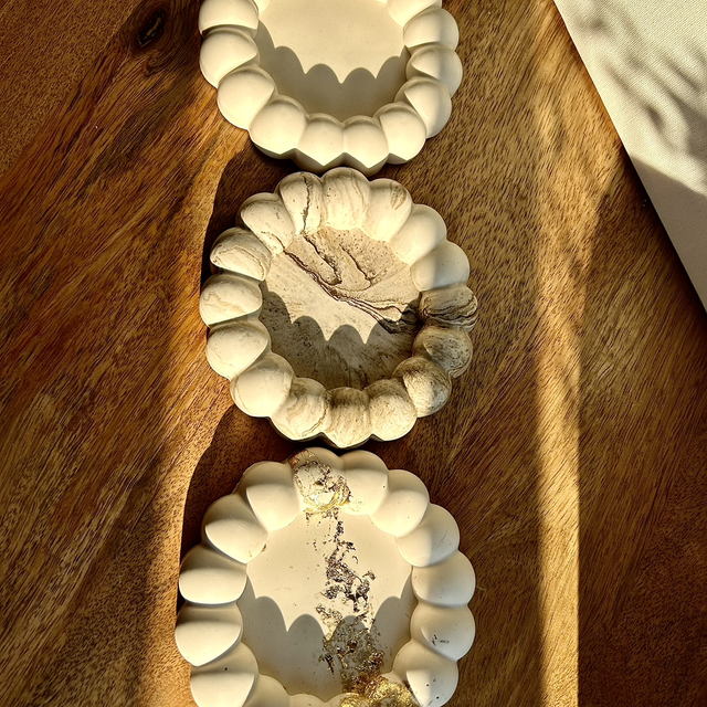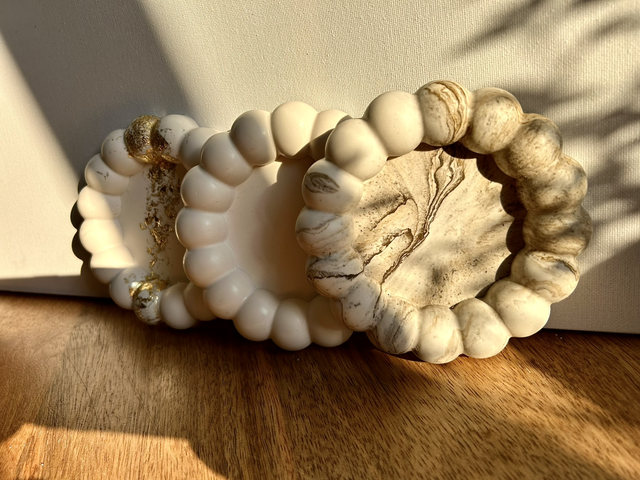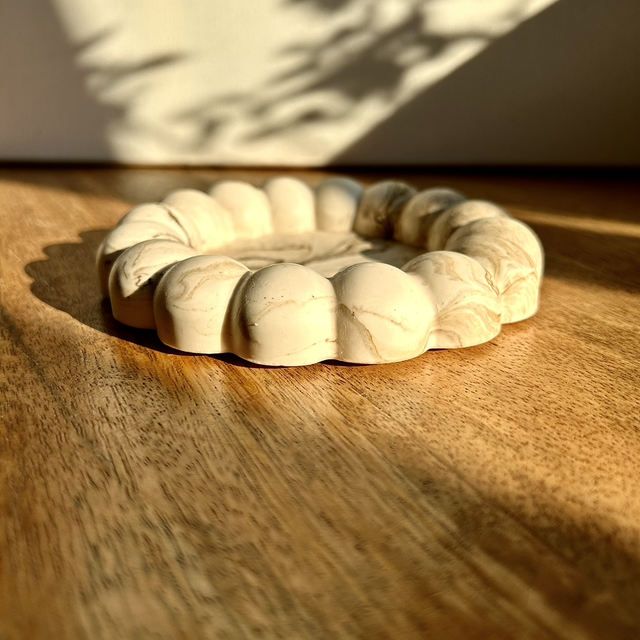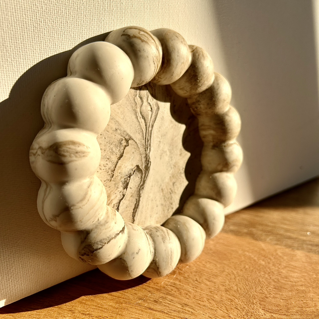 Plateau rond avec grosses boules, effet marbre beige, 12,8 cm de diamètre.